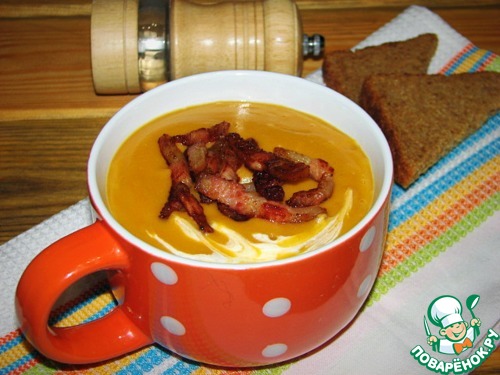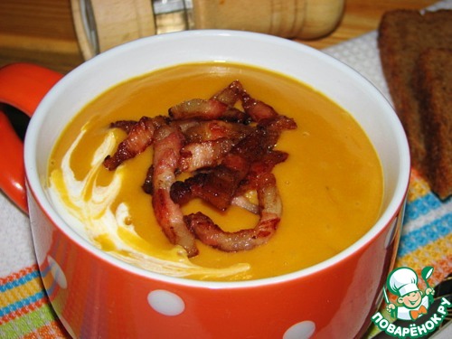 Суп разлить в тарелки, сверху выложить ломтики обжаренной грудинки.