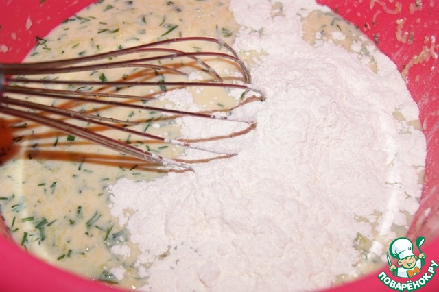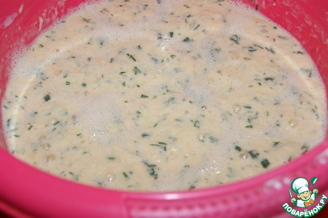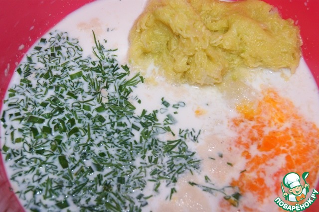 В миску с активированными в молоке дрожжами добавить кабачки, взбитые вилкой яйца, зелень, соль и перец. -