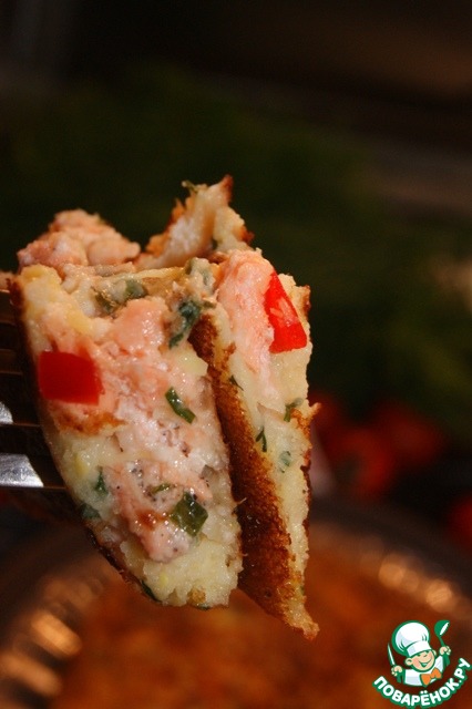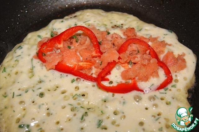 Сковороду смазанную маслом нагреть и вылить на нее тесто. Не ставя сковороду на плиту поместить на край начинку - рыбу, а сверху перец.