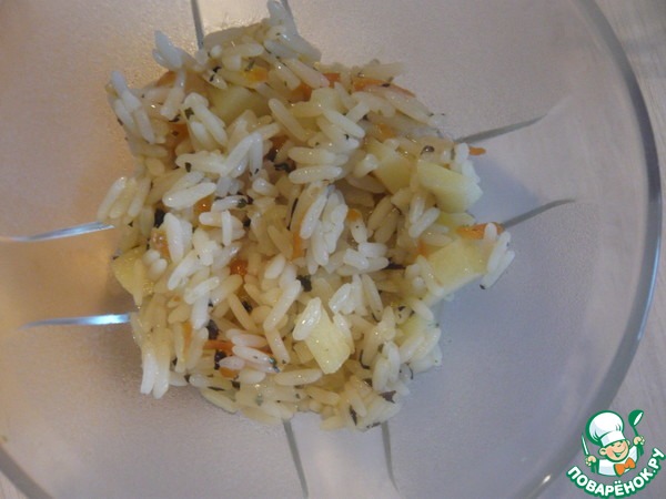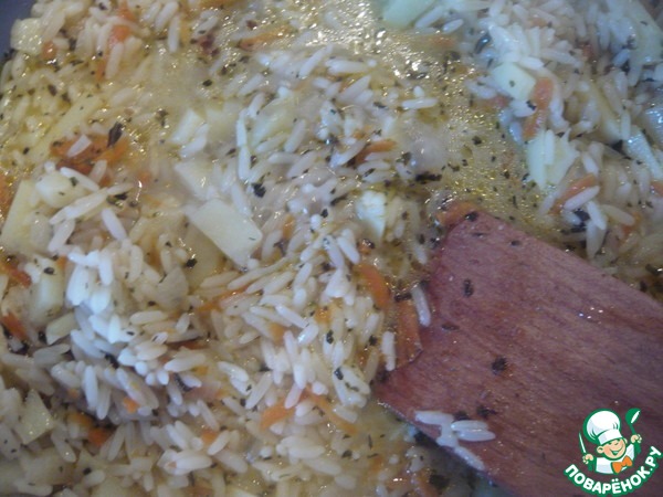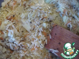 К зажарке добавляем рис и порезанный брусочками картофель. Солим. Добавляем воду и тушим примерно 30 мин. до готовности. По необходимости доливаем воду. Сливочное масло отправляем к рису.