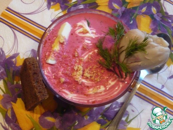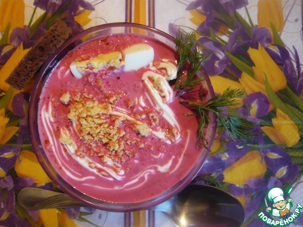 Разливаем бульон из свеклы по тарелкам. Добавляем 1/4 яйца в каждую тарелку. Присыпаем зеленью, подсушенным рисом. Подаем со сметаной. Этот вариант без курицы.
