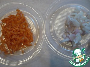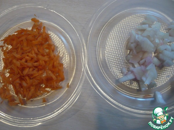 Лук режем кубиком, морковь трем на терке.