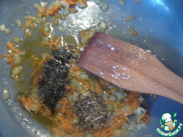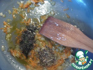 К зажарке добавляем вино, мяту базилик. Тушим 1 мин.