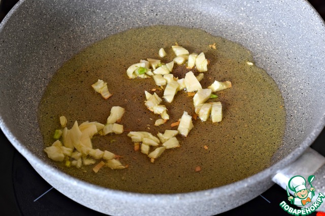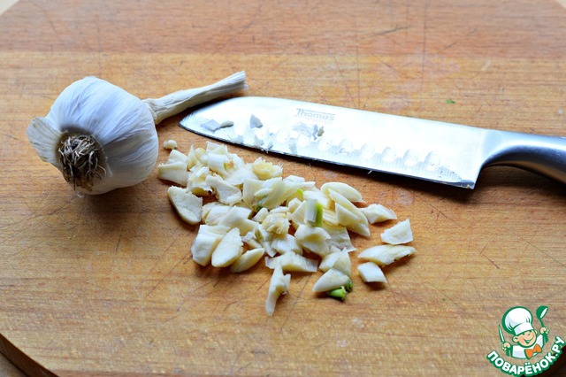 Два зубочка чеснока очистить и плоской стороной ножа раздавить их. Порубить крупно на несколько частей. -