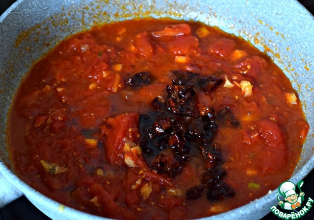 Добавить вяленые томаты, нарезанные на кусочки и посолить соус. Перемешать и проварить его пару минут.