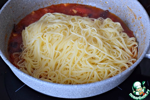 Чайник закипел. Влить кипяток в кастрюлю, посолить и варить спагетти, согласно инструкции на упаковке. Я использую для этого блюда самые тонкие спагетти, которые варятся 5 минут.