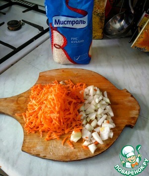 Трём морковь на крупной терке, лук нарезаем мелкими кубиками! Все это отправляем в кастрюлю и варим ещё 10 минут.