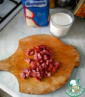 Колбаски нарезаем кубиками и засыпаем их в кастрюлю, выливаем туда сливки и засыпаем специи!