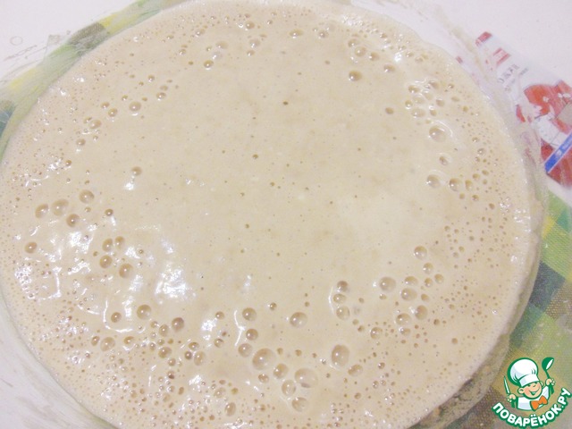 Накрыть кухонным полотенцем и поставить в теплое место для расстойки примерно на 1 час. В принципе, уже через час, когда тесто подойдет, блины можно печь. Но, лучше всего размешать тесто и дать подойти ему еще раз.