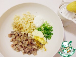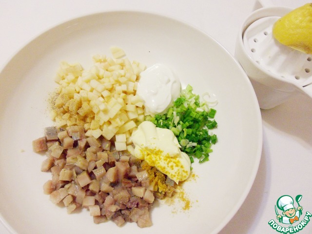 Пока тесто подходит, можно приготовить начинку. Разделать соленую селедку на филе и мелко нарезать. Зеленое яблоко очистить от кожуры, удалить сердцевину и нарезать мелкими кубиками. Зеленый лук так же мелко нарезать. Добавить майонез, сметану, лимонный сок. Приправьте карри и черным молотым перцем. Все перемешать, обязательно попробовать, возможно вам захочется добавить лимонного сока или майонеза.