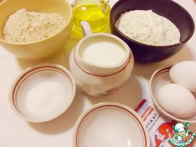 Для приготовления теста для блинов понадобятся 2 вида муки, пшеничная и гречневая, с ней вкус блинов становится более интересным. А так же, яйца, молоко, сахар, соль и, конечно, дрожжи.