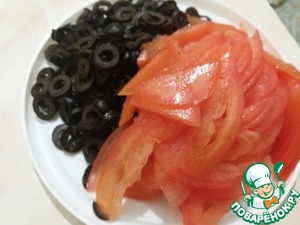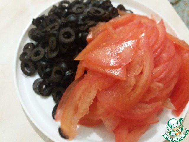 Маслины + посыпаем сыром и в духовку при 170-180 градусах на 9 - 10 минут.