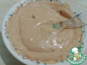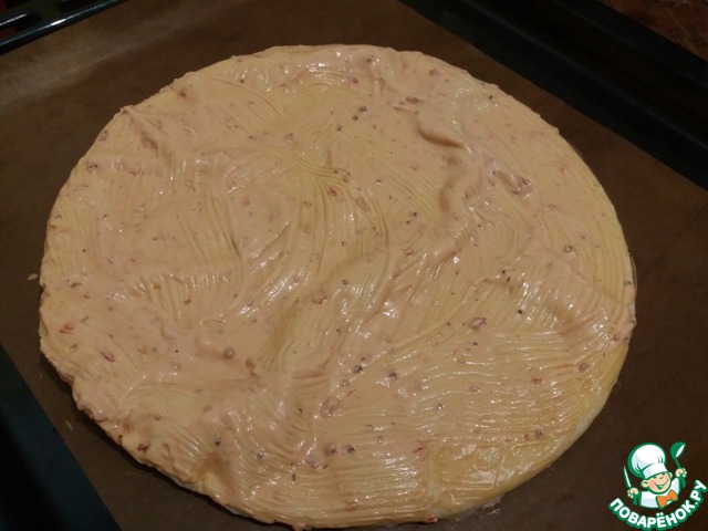 Теперь смазываем поверхность круга соусом из майонеза и кетчупа (соус наносить удобно с помощью силиконовой кисти)