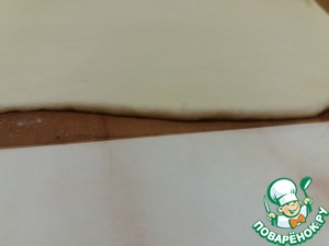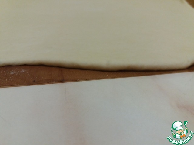 На подпыленную мукой поверхность кладем тесто и раскатываем до 3-5 мм (я раскатывала на пергаменте, чтобы проще было тесто перенести на противень)