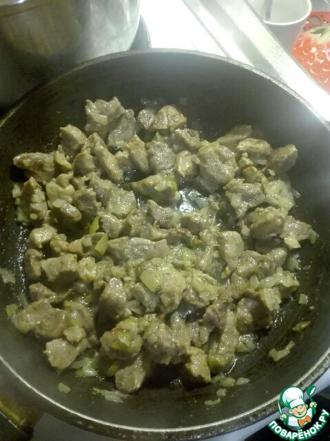 • Моем, нарезаем мясо кубиками. Лук чистим и нарезаем мелко.