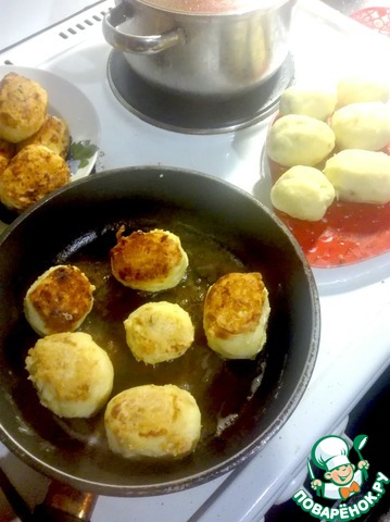 • Обжариваем на растительном масле до готовности. Добавляем специи и соль. Пока готовится мясо, чистим, варим картофель. Делаем пюре. В пюре добавить 4ложки муки и 2 взбитых яйца.
