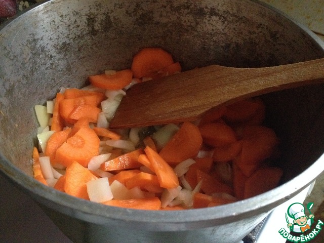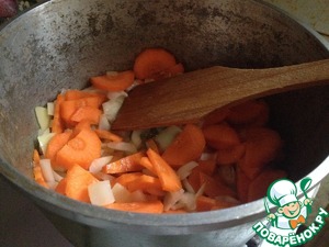 Морковь нарезать кружочками. Добавить к луку. Готовить вместе 5 минут. -