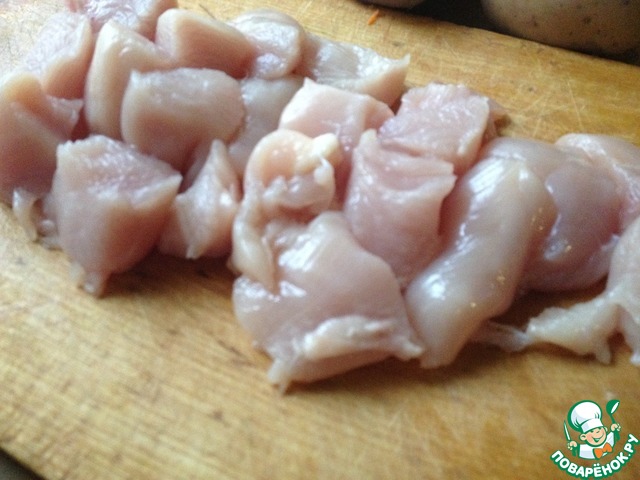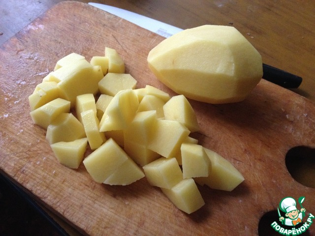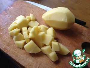 Картофель нарезать кубиками. Добавить к курице в сотейник.