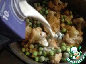 Добавить в сотейник замороженные зелёный горошек и цветную капусту. Досолить. Влить сливки. Довести до кипения и готовить на маленьком огне под крышкой до готовности.
