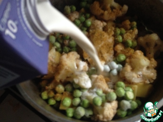 Добавьте нарезанный картофель, цыетную капусту, зелёный горошек и сливки. Посолить, посыпать приправой. Влить сливки. Выставить режим "Тушение". Готовить примерно час.