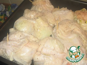 Сверху посолить, поперчить, положить кусочек куриного жира, он всегда есть на шкурке.