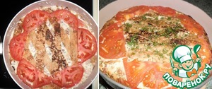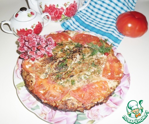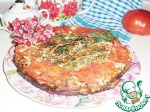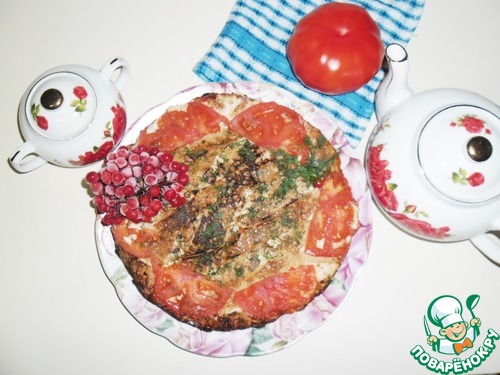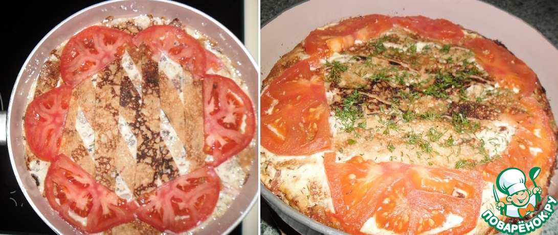 Сковорода должна быть слегка горячей. На вылитую смесь можно выложить несколько полосочек блинчиков и помидоры. Накрыть крышкой, выставить среднюю температуру на плиту (я вначале поставила на "5" из "9"), выпекать 20 минут, затем чуть снизить и печь ещё 15-20 минут. Контролируйте, сильный огонь не нужен. Продукты должны просто пропечься, а не жариться. Убрать огонь, посыпать верх блинов рубленной зеленью, оставить в сковороде немного остыть и можно подавать. Можно из сковороды даже,