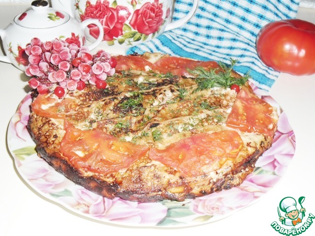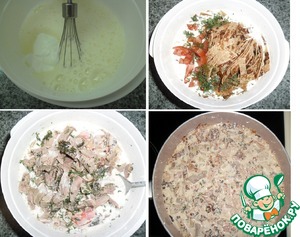Взбить яйца в стойкую пену, добавить сметану, крахмал (ложка с горкой) и специи, хорошо размешать, можно миксером. В эту смесь выложить помидоры и блинчики, перемешать, пусть они пропитаются заливкой. Добавить мясо с зеленью, перемешать и вылить в нагретую сковороду, в которой предварительно нагреть масло и слегка посыпать чесночным порошком (не указывала в ингредиентах, т. к. это на любителя).