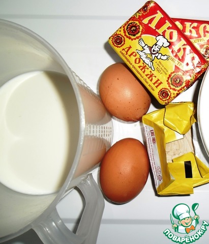 В "ожившие" дрожжи добавить слегка нагретое молоко, добавить сахар и соль, хорошо размешать. Всыпать муку и перемешивать до исчезновения комочков, добавить масло, перемешать. Накрыть лёгким полотенцем и оставить в теплом месте на 30 минут. Взбить яйца и добавить их к созревшему тесту, аккуратно перемешать. Можно выпекать.
