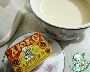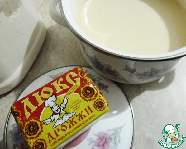 Замесить тесто обычном способом. В теплой воде развести дрожжи с сахаром и 1 ст. л. муки. В теплом месте сырые дрожжи ЛЮКС ЭКСТРА от компании "САФ-МОМЕНТ" быстро дадут хорошую пену (если у вас незнакомые - дайте им хорошо поднятся и, когда они осядут, только тогда начинайте с ними работать)