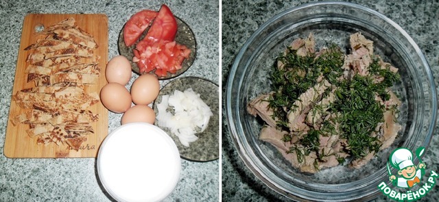 Остывшие блинчики нарезать полосками, лук тонкой соломкой, помидоры кубиками (несколько полуколечек оставьте для верха, но это по желанию). Мясо или колбасу нарежьте произвольными кусочками, не мельчите. Зелень порубить.