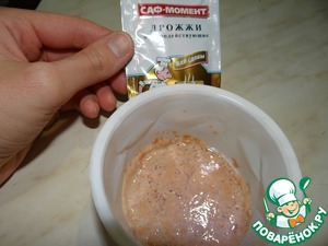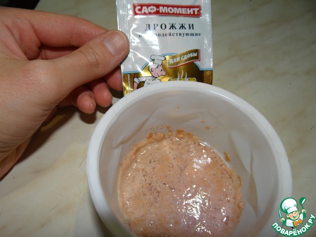 В 3 столовых ложках теплой воды и 1 ч. л. сахара разводим дрожжи 2 г, оставить на 10 минут