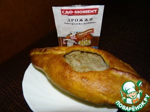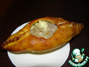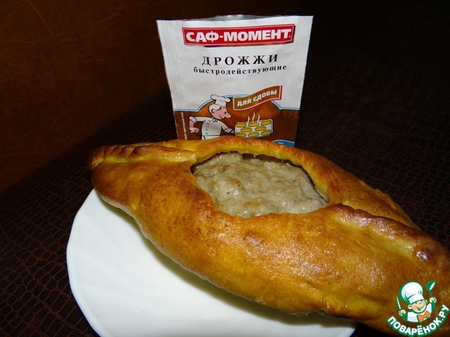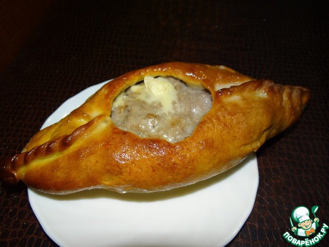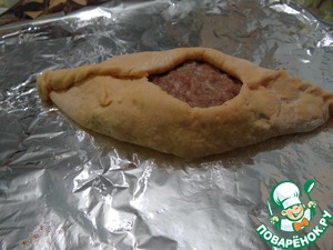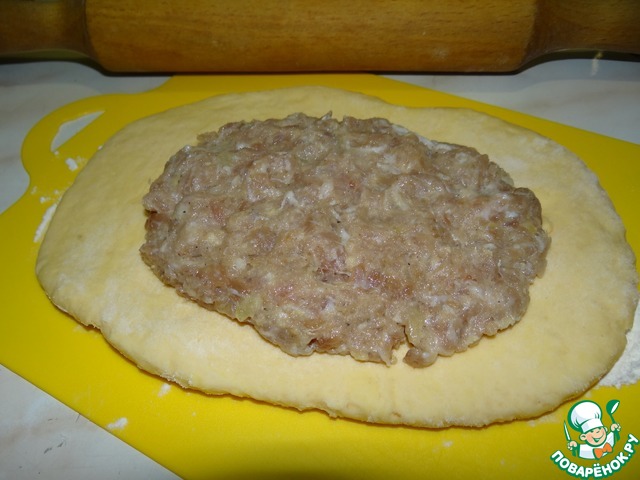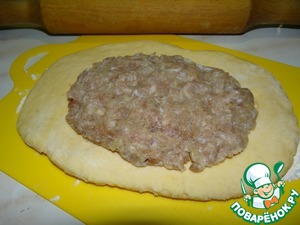 Подошедшее тесто раскатываем и выкладываем начинку из фарша (у меня свинина с жиром+много лука+соль+сахар)