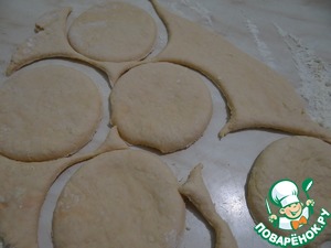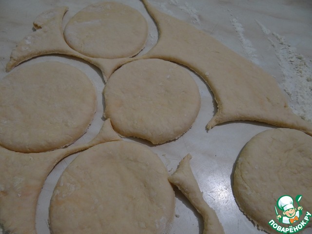 Выемкой или стаканом нарезаем кружки, которые слегка раскатываем скалкой -