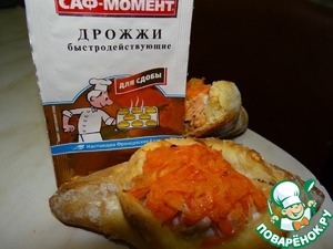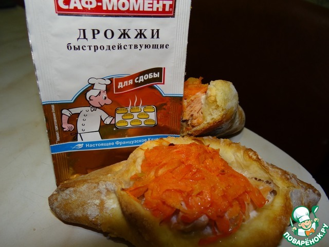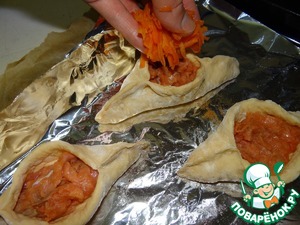 Края расстегая защипываем, оставляя середину открытой, поверх рыбы выкладываем отваренную морковь.