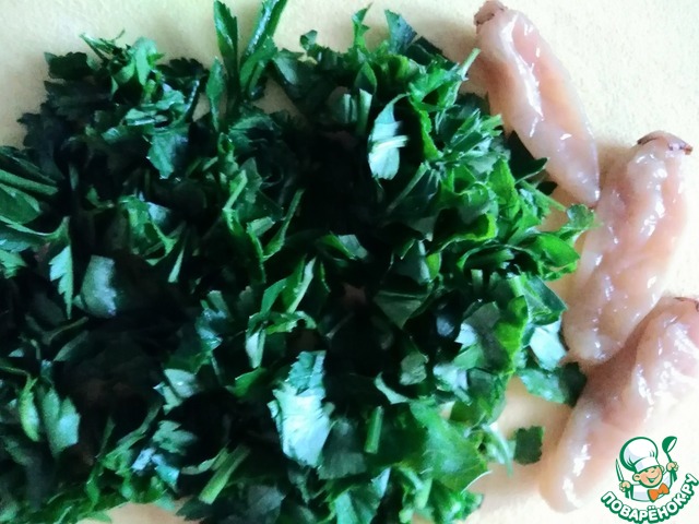 Нарезаем петрушку. А этот перчик для огнеедов, кто любит погорячее. Его кладу индивидуально в тарелочку.