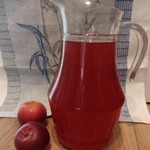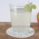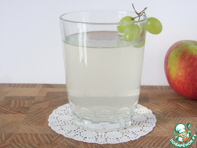Засыпьте сахар, прокипятите и отварите там яблоки. Затем вылейте всю жидкость в компотницу, добавьте виноград, лимонный сок и охладите.