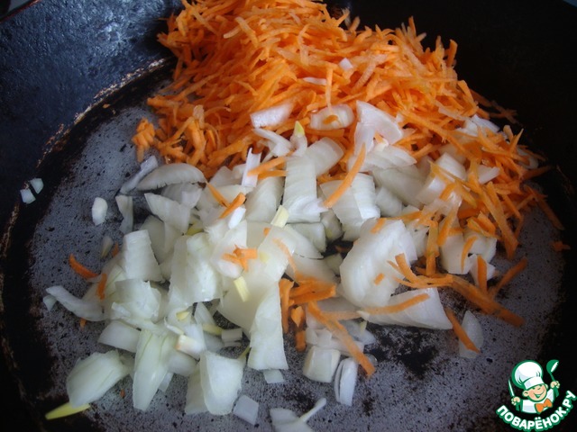 • Лук порезать кубиками, морковь натереть на мелкой терке. Обжарить на растительном масле.