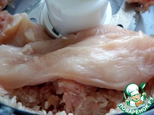 Куриное филе пропустить через мясорубку дважды или пробить в блендере. Я брала целую грудку и сняла филе, а из остатков сварила бульон.