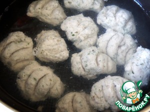 Вскипятить пол литра воды в низкой и широкой кастрюльке. Подсолить воду по вкусу. С помощью двух чайных ложек разделать фарш на небольшие кнели. Одной ложкой набирать фарш, выравнивая его по стенке миски, второй ложкой сделать несколько насечек и ею же сдвинуть фарш в еле кипящую на медленном огне воду. Варить кнели после всплытия минуты 2-3. Оставить на краю плиты.