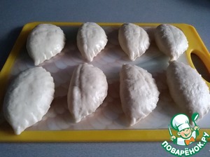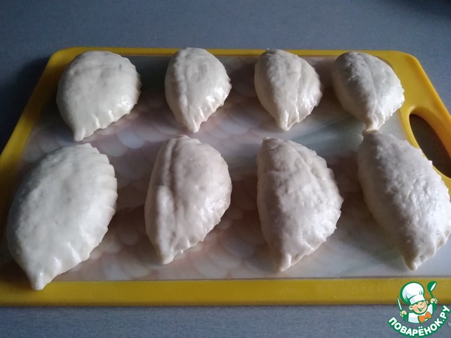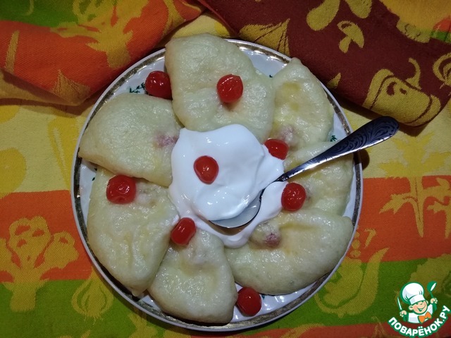 Из комочка теста делаем лепешечку, в центр которой кладем начинку. Я положила еще вяленую вишню. Я использовала такое устройство для лепки. Можно конечно же лепить руками.