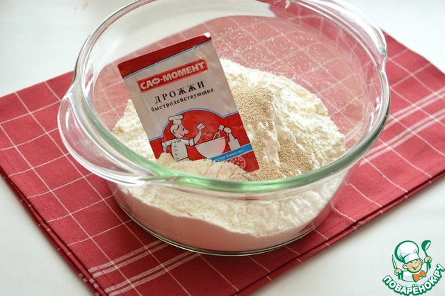 Просейте в миску муку, добавьте соль, сахар и сухие дрожжи "Саф момент" |
