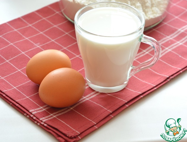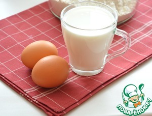 Молоко подогрейте до температуры 35-36°С. Влейте к муке молоко и добавьте яйца |
