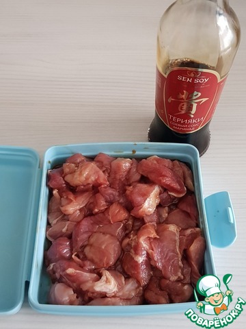 Нарежем произвольно небольшими кусочками свинину и замаринуем ее в соусе. У меня соус Терияки. При его отсутствии можете использовать обычный соевый соус. Мариновать желательно не менее получаса, если дольше- даже лучше. Затем отжать мясо и выложить на бумажную салфетку, обсушить. Если этого не сделать- масло будет "стряляться" при последующем приготовлении.