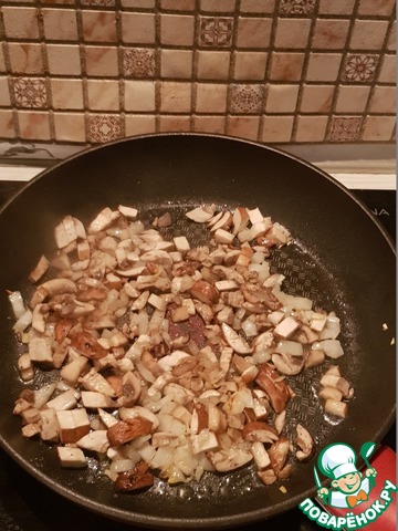 Далее в другой сковороде разогреваем 1.5 столовые ложки масла и выкладываем лук. Жарим на среднем огне минуту, добавляем щепотку соли и грибы. Жарим около 3-4 минут, перчим (на свой вкус). Не забываем помешивать. Снимаем с плиты, даем "отдохнуть" около 10 минут.
