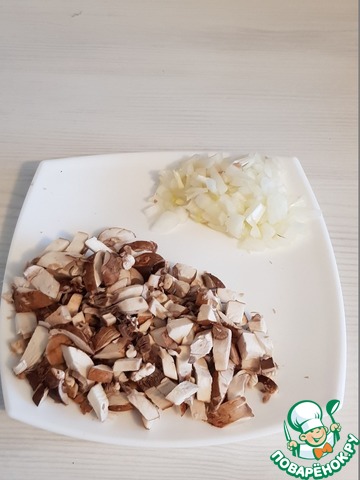Далее нарежем репчатый лук и шампиньоны. Для любителей грибов - можно добавить шампиньонов побольше.