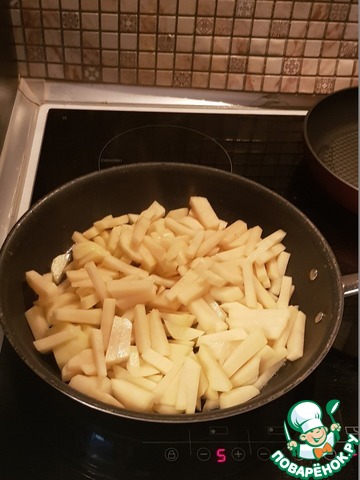 Начнем готовить. Нарежем картофель брусочками. Мясо обсушено. В сковороду наливаем масло- около 3.5 столовых ложек, разогреваем на сильном огне, кладем картофель. Не солим, не перчим, убавляем огонь до среднего и крышкой не накрываем полностью.