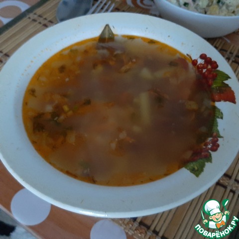 В кипящую воду отправить свинину на кости, у меня свиное рагу 300-350 г. Варить бульон 1-1,5 часа ( мясо должно легко отделяться от кости). Добавить перец черный и душистый, соль по вкусу.