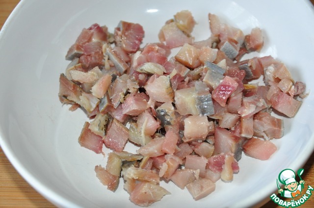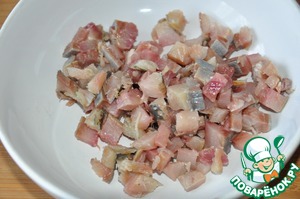 Берём малосольную сельдь, у меня собственного посола, чистим, разделываем на филе и мелко режем.