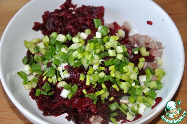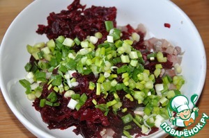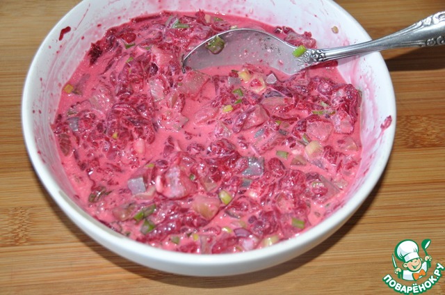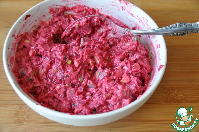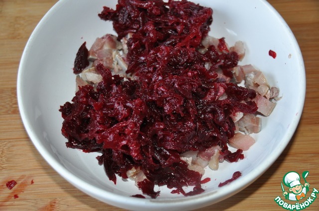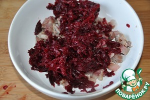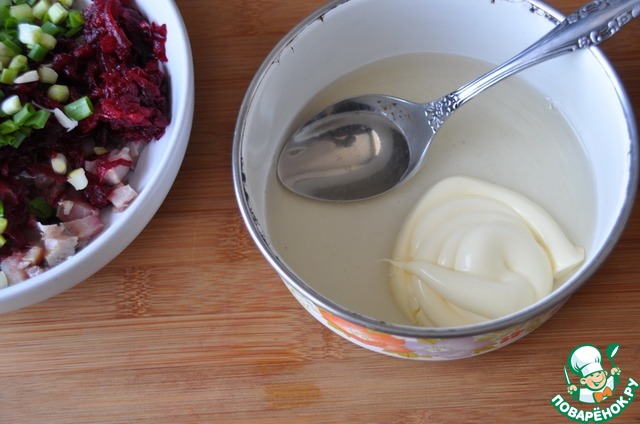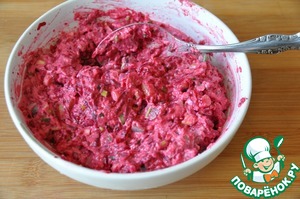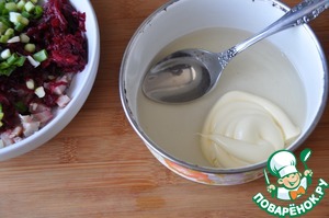 Перемешиваем свеклу с сельдью и смесь из майонеза с желатином.