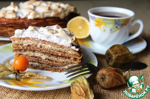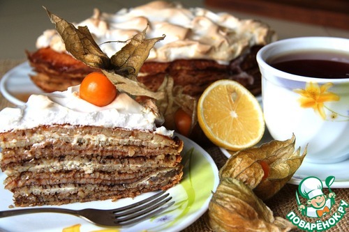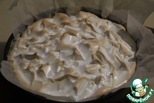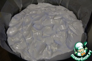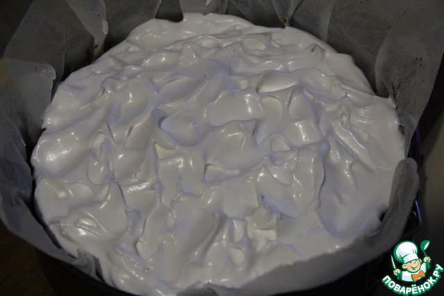 Готовый торт поставить минут на 15-20 в горячую духовку. Тем временем взбить белки с сахаром до устойчивых пиков. Вынуть торт из духовки и нанести на его поверхность меренгу.